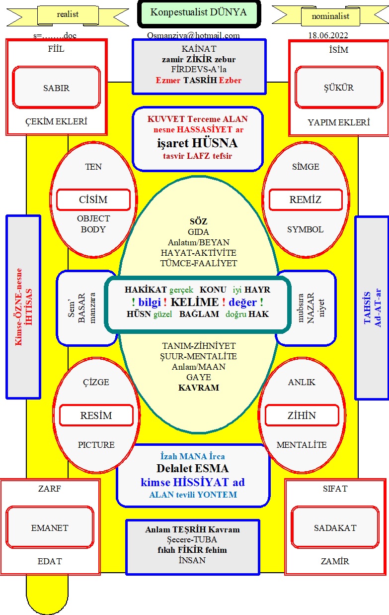 ![]() Bu yukarıdaki yalın tablodan aşağıdaki karmaşık tabloya nasıl geçtik DUNYA dizini içindeki 35 tablo ile açık ve seçik olarak anlatılmıştır.. ancak günlük dilin düz yazısı ile değil de YBA hızlı anlam sürücüsü ve anlatım aygıtı ile.. 20220618_054033_DUNYA.rar Görüldüğü gibi dışarıda KUTULARDAN sadakat ve emanet ile şükür ve sabırdan kurulu bir dış çerçeve bulunuyor. Bir de bunun altında YUMURTALARDAN cisim ve remiz ile resim ve zihinden kurulu bir iç çerçeve yer alıyor. Bir de ortadaki BÜYÜK YUMURTA içinde hakikat ve hayrı ile hak ve hüsünden kurulu iç DİKDÖRTGEN konumlanıyor. Ancak asıl anlatım “ikincil”NESNE ve KİMSE ile “birincill” AR (harf) ve AD(isim) göstergelerinden ve işaretlerinden kurulu gizemli var oluş ve yok ölüş ile aid oluş ve sahib oluş.. Bu gün nasıl analitik düzlemin matematik kullanımı herkes tarafından kullanılabiliyorsa ve sadece kuru bir ad olarak Descartes'in adı varsa yarında YBA herkes tarafından kullanılacak ve kuru bir ad olarak Osmanziya kalacak.. Hatta nasıl geometriden aritmiteğe geçen Descartes adının altında aritmetikten geometriye geçen FERMAT bulunuyorsa ve Dekart ve Fermatın çalışmasından bu günkü aritmetik kullanım haline getieren EULER bulunuyorsa.. bu iş yaklaşık yüz yıl sürmüşse.. elbette herkes şakkadanak YBA kullanmaya başlamayacak.. başka isimlerde bu bayrak yarışına katılacak.. ancak bizler bu gün ondan kişisel ve bireysel olarak ne kadar yararalanabilirsek o yanımıza kar olarak kalacaktır.. diye düşünüyorum. Ancak sizler hazır olmuş bitmiş argumanlar ve enstrümanlar arıyorsunuz.. yanılıyorsunuz.. çünkü onu inşa edecek sizlersiniz. ![]() Düzenleyen osmanziya - 18-Haziran-2022 Saat 05:53 |