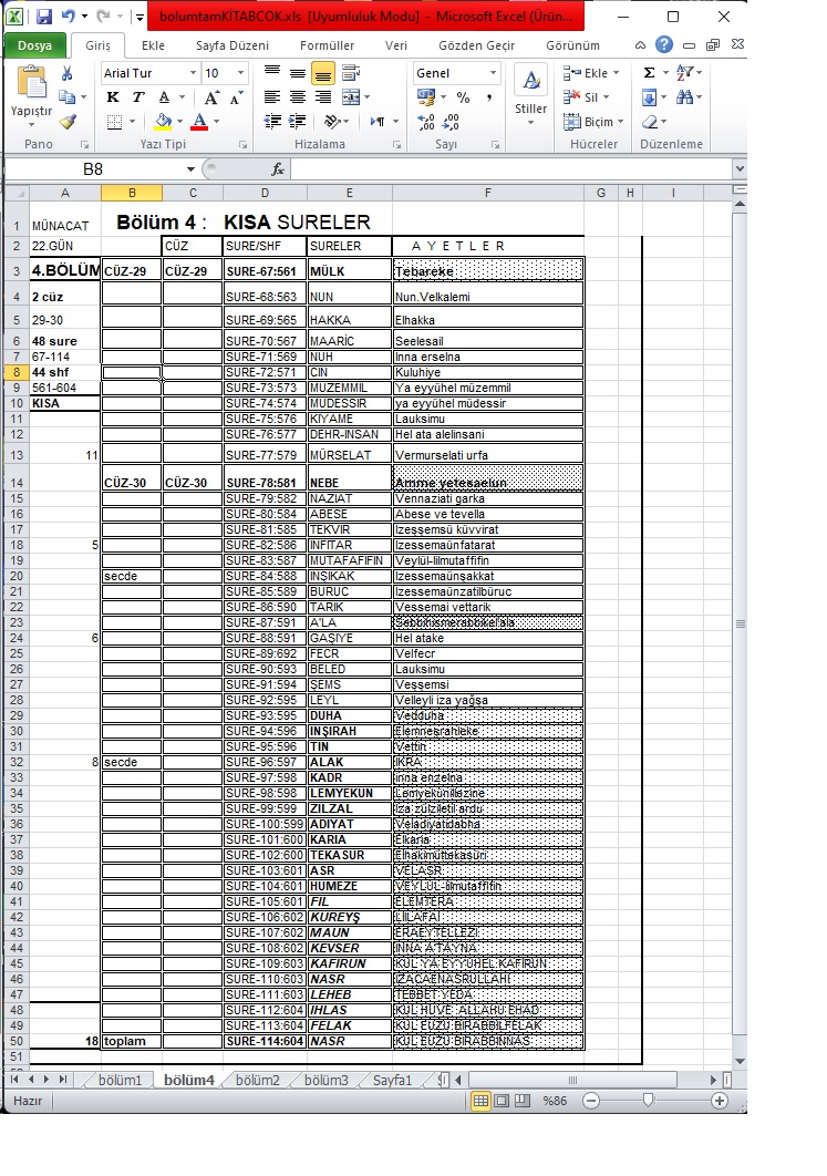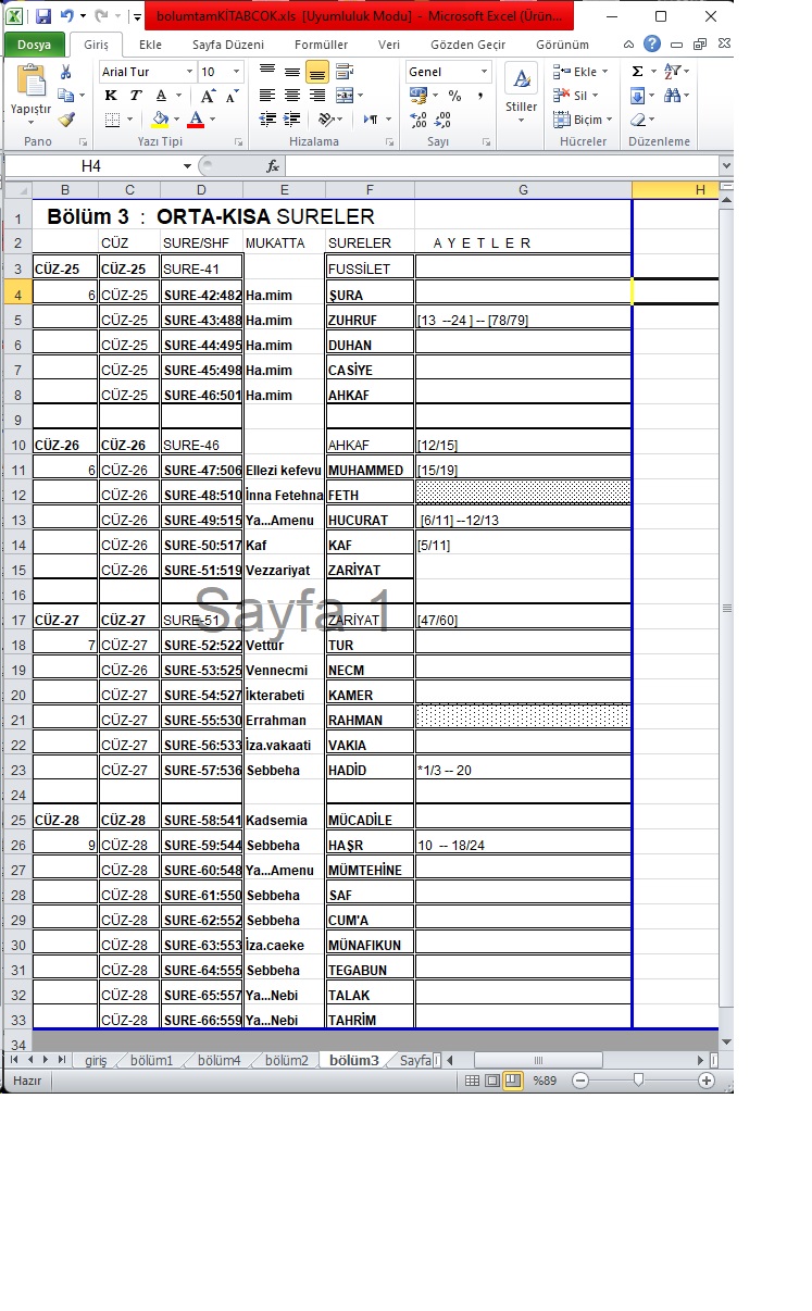 YENİ TASNİF Kur'an-ı Azimüşşan'daki surelerin nicelik yönünden geleneksel ayırımda üçlü tasnif benimsenmiştir. Baş taraftaki uzun sureler, aradaki orta sureler ve sonundaki kısa sureler. Bölümleme elbette rasyonel ve kurgusal bir işlemdir. Ancak ne kadar doğal ve ne kadar gerçekçi olursa, tanıma ve bellemede o kadar kolay ve kalıcı olur, diye düşünüyoruz. Kur’an-ı Mu’ ciz-ül-Beyan’ı tanımanın ve onun olağanüstü bilgi kaynağına erişmenin ilk şartı elbette onu okumaktır. Okunan bölümlerinin (surelerinin) sıralanmasını öğrenmede, meşhur 4444 duası ve salavatının feyziyle kolay ve kalıcı olduğunu umduğumuz yeni bir tasnif öneriyoruz. 4444 yöntemiyle yaptığımız ayırımda DÖRTLÜ BİR TAM BÖLME yapabilmek için önce ( 4 x 4 =16 ) ilk on altı cüzü BİRİNCİ BÖLÜM; sonra onun yarısı kalan on altı cüzün ilk sekiz cüzünü İKİNCİ BÖLÜM; sonra kalan son sekiz cüzün ilk dördünü ÜÇÜNCÜ BÖLÜM; son ikisine de DÖRDÜNCÜ BÖLÜM yaparak, kolay ezberlemek ve sistematik tanımak amaciyle yeni bir tasnif yaptık. Bu bölümlerin cüz’ ve sure verileri grafike edildiğinde Lafzı Celali vermiştir. Exel kolaylığından yararlanarak, ezberimizde olan ve ezberlemek istediğimiz ayetleri numaralarını bölümler ve sureler listesinde işaretlemek suretiyle takip ve kontrol imkanı ortaya koyduk Mustafa BUĞÇAM 24.05.1998 Ankara