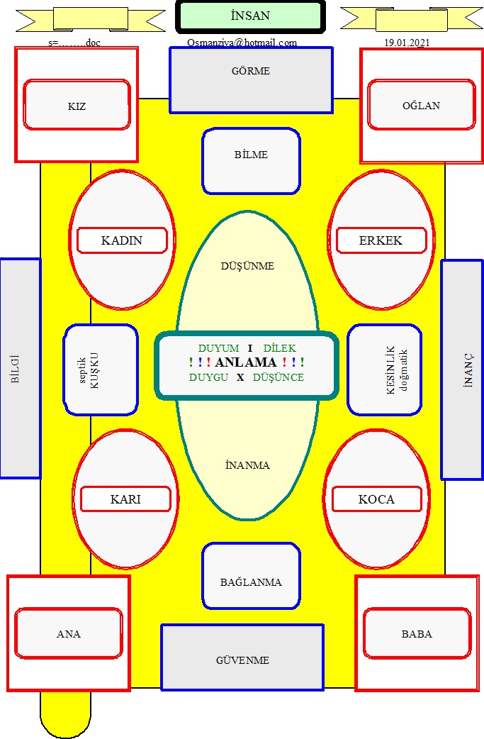Eğer şu dünya bir DAĞ olarak temsil edilirse bunun iki yararı olur, birincisi BUZDAĞI denilen AYSBERG gerçeğini gösterge haline getirmeye diğeri kadın-erkeği birlikte göstermeye yarar. Çünkü bir buz dağında suyun altında görünmeyen kısmı ŞUUR ALTI’nı temsil ediyorsa ve suyun üstündeki kısmı ŞUUR’u göstermeye yarıyor.. Bunun gibi aysbergin suyun üstünde görünen kısmı KADIN-ERKEK’tir.. altındaki görünmeyen kısmı bizim KURAMLARIMIZLA, bilgilerimiz ve inançlarımızla ördüğümüz GERÇEK’tir. Bu gerçeği altı bin yıldır.. özellikle son bin beş yüz yıldır.. özellikle son üç yüz yıl yıldır.. özellikle son otuz yıldır ve özellikle son ÜÇ yıldır.. öre öre bitiremiyoruz ve bunu İSTANBUL sözleşmesi ile noktaladık… Şimdi bu noktayı tartışıyoruz. Aşağıda FACE dünyasında Kadir AKTAŞ Kardeşimle Dinnur YAŞAR adımla bir paylaşım yaptık.. o görüşünü söyledi ben görüşümü söyledim.. bu söylediklerimi ve onun face sayfasında yayımladığım tabloları aşağıda yükledim.. buraya bakarak konu hakkında bilgilenebilirsiniz. Buraya da sıkıştırılmış iki alt dizini bulunan KADIRAKTAŞ rar dosyası içinde 27 tablo Word dosyası ile kadın ve erkek ilişkilerinin YBA çözümlemeleri yaptım. Versiyon sırasıyla yalından karmaşığa doğru bunları imgeler ve irdelerseniz burada yapılan analizleri görsel, mantıksal ve metodik olarak muttali olursunuz. Bu rar dosyasını buraya yüklüyorum: 20210119_181046_KADIRAKTAS.rar Şimdi bunların hepsini günlük dilin düz yazısına döküp çevirmeyeceğim. İlgilenen arkadaş olursa bu tabloyu JPG dosyası olarak buraya yapıştırır üzerinde düz yazı ile tartışabiliriz. Bilgi, sevgi ve saygı ile sağlıcakla kalınız. Dinnur YAŞAR 19.01.2021 |