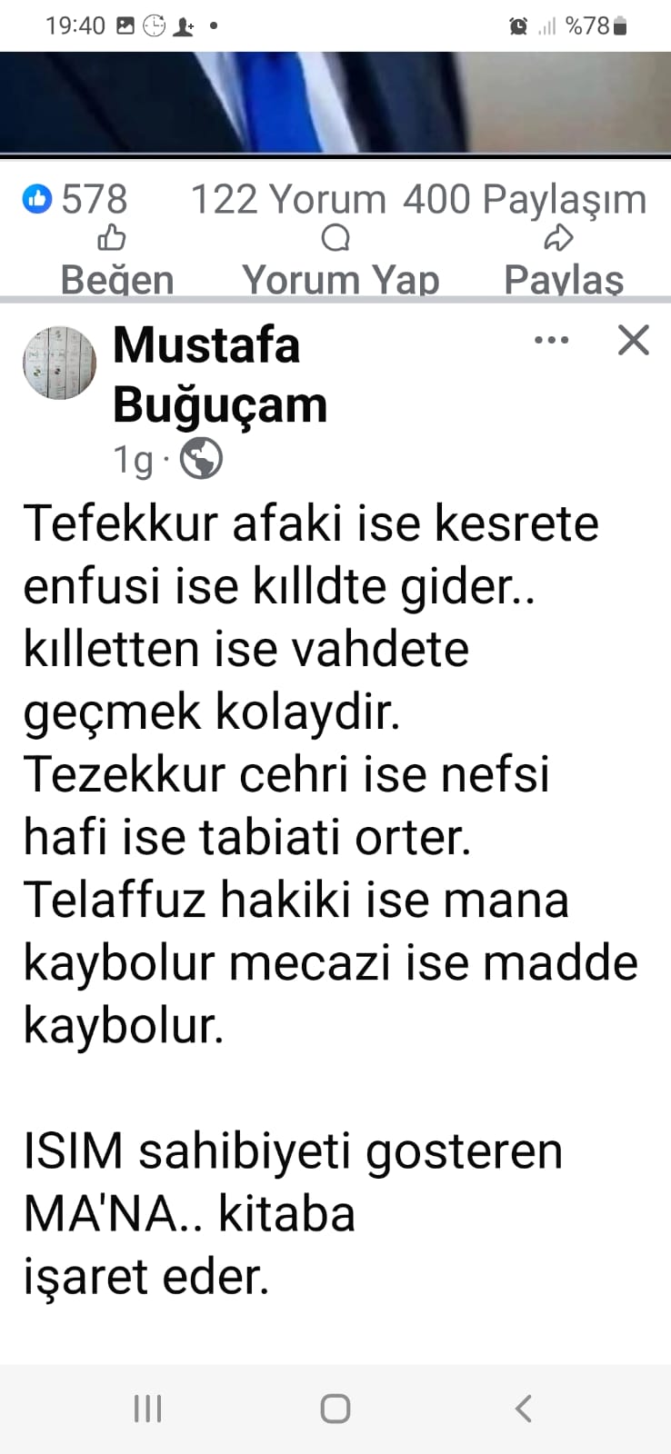 [19:04, 22.10.2025] Mustafa Buğucam: Bu paylaşimda tefekkur ve tezekkurden başka bir de LAFZIN hakiki ve mecazi ma'nasi ile MA'NA nın ismî anlamindN ve harfî anlamimdan da söz etmiştir.. bunlarida anlatirsal is uzar.