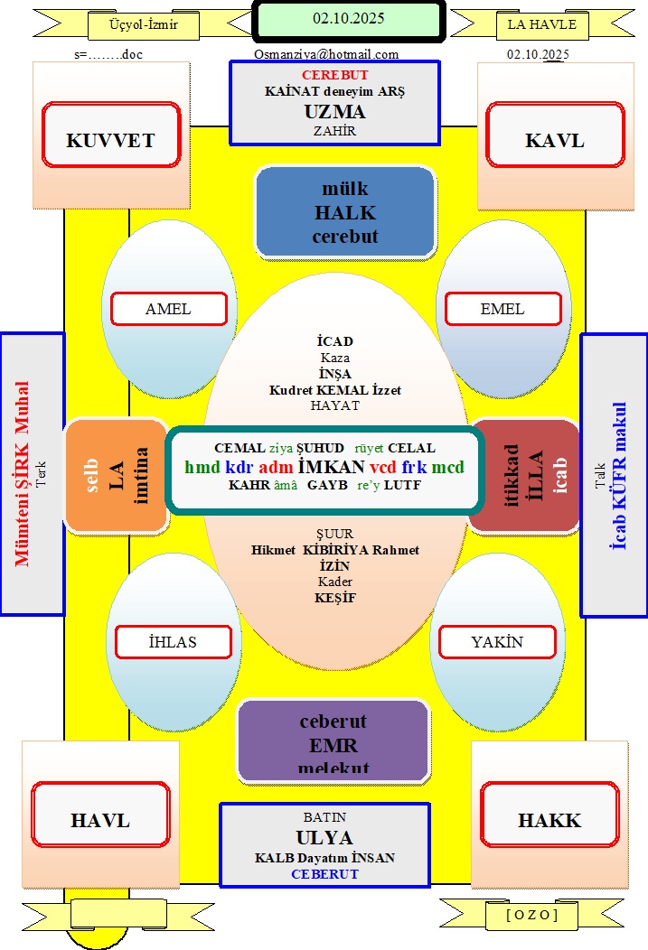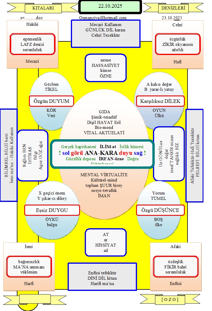 Altı sene önceki paylaşım.. KELİMENİN sağındaki İSİM ile solundaki İLMİ yazmayı.. unutmuşum.. ya da kalabalık olmasın diye yazmamışım.. dört tane boşluğu da henüz doldurmamışım.. bu bir CUMHURİYET paylaşımı olmuş.. 96 ncı yılında.. Cumhuriyetimiz ve demokrasimizi ve laikliğimizi.. yani lâikraheliğimizi.. meşveretimizi.. halkın yönetimini.. genişleteceğiz ve geliştireceğiz.. sadece inanan dincilerin.. sadece düşünen bilimcilerin tefrit ve ifratından sakınarak ORTA yolu sürdüreceğiz.. ki bu orta yolun istikameti DOĞRU yol ve KISA yol olarak bilinir.. lakin çoğu dincinin din ve yol arasında farkın ayırdında olmadığı bir vakıa.. aslında bu kısa ve doğru ve ortayol VAKIA suresinde SABIKUN olarak adlandırılmış ve tanımlanmıştır.. yani ashabi şimal SOLCULAR ile ashabı yemin SAĞCILAR arasında mücadeleden sıyrılabilen ÖNCÜLER.. Yalnız bunu anlatmak o kadar zor ki sağcıların kör sol GÖRÜŞ'üne.. solcuların sağır sağ DUYUŞ'una.. dokundurmadan.. belki bu tablodaki boşlukları doldurursak onlara da anlatabiliriz. Saygılarımla osmanziya yontembilim.com 23.10.2025 üçyol izmir 19:43