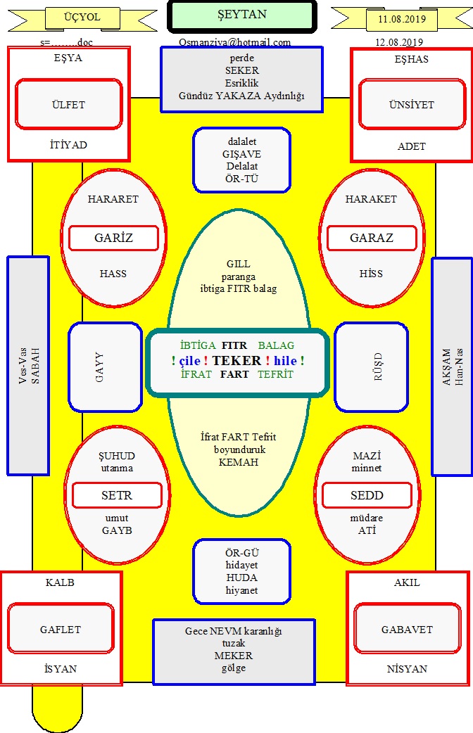 Şeytanı daha çok kalbimize gelen vesvese ve kuruntu ile tanırız.. duyum ve duygularımızdaki dalgalanmalar.. olumsuz olursa biliriz.. düşünce ve dileklerimizde titreşimler.. negatif olduğunda anlarız. Genelde karanlıktır.. kapalıdır.. fakat aydınlık ve açık olanları da bulunur.. bu tabloda daha önce yayımladığın SUİ tablosunu da göz önünde bulundurarak bakmak lazım.. bu tabloları DİLİN BEŞ İŞLEVİ başlıklı yazıda sunmuştum.. yani İNSAN tablosunun gölgesi olarak ŞEYTAN tablosu var.. Protogoras her şeyin ölçüsü İNSAN'dır.. demiş.. Tanrı ve Şeytan'ı tanımak için önce İNSANI tanımak lazım.. insanı tanımadan sadece Kainattan ve sadece Kur'an'dan edinilen bilgilerle ne dil ne de din ve ne de dünya açık ve seçik olarak ortaya çıkmaz.