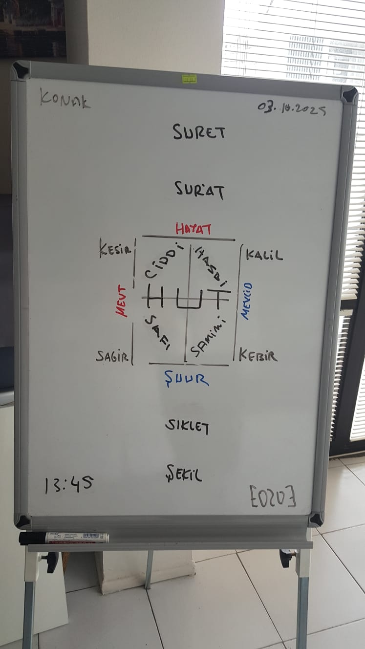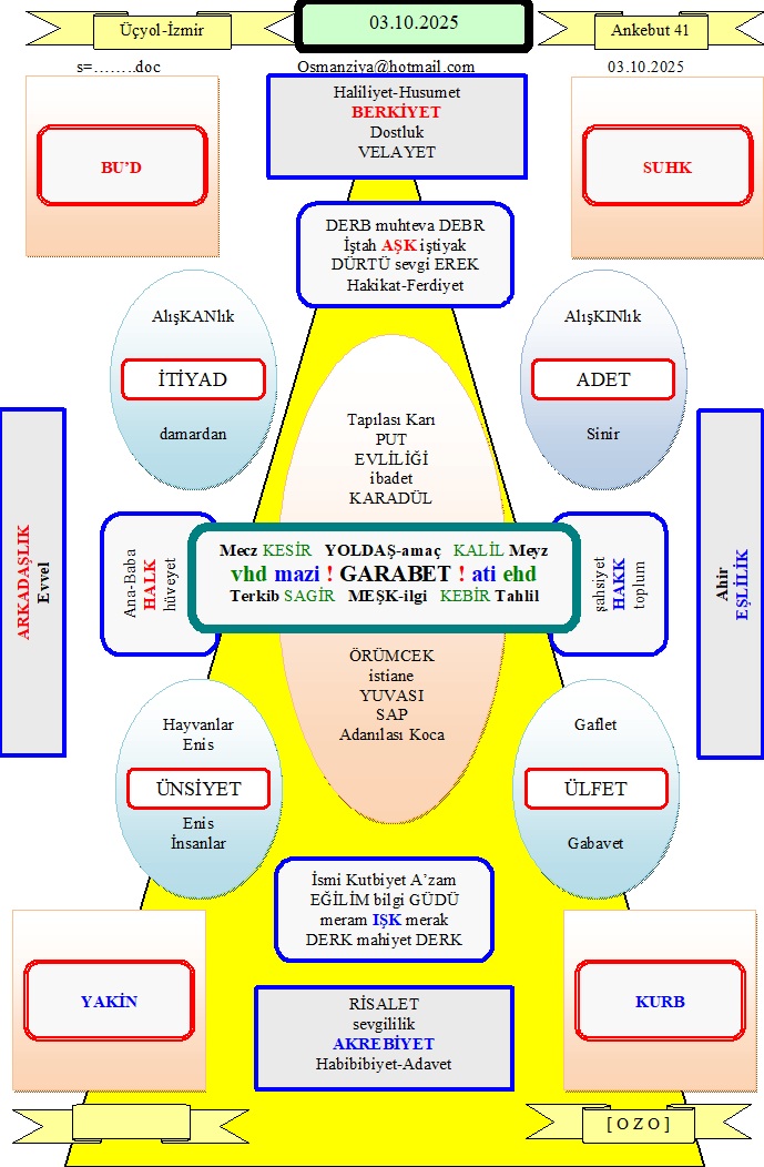 YBA YÖNTEM BİLİMSEL ANALİZ Analitik Düzlemin METODİK Kullanımı ![]() 02.10.2025 çalışması.. ![]() ![]() Bu YBA in bir uyarısıdır ![]() ![]() Bu YBA in bir duyurusudur ![]() ![]() Değerli Hocam, Bu günkü katılımınız için teşekkür ederim. Yaptığımız KURBİYET çalışmasını evde yirmi iki tablo üzerinde düzelterek yirmi ikinci tabloyu burada resim halinde gönderiyorum. Bu tabloyu ilk bakışta hepsini anlamanın zor olduğu malumunuzdur. Bu resme öncesi 21 word çalışmasını İnşaallah web sayfama yüklersem size linkini gönderirim. Çalışmamızda YAKINLIĞIN (Kurbiyetin) nasıl çok yönlü ve yanlı olduğunu anlamaya ve anlatmaya çalışmıştım.. bu çalışmayı evde tablolar ile ilerletince KARABET, "Garabet"e dönüştü acib bir duruma aldı. Teorik bu'd ve yakin.. pratik suhk ve KURB.. durumu muhal ve makülün ötesinde.. küfürden imtina derecesi ile şükür ile iman derecesi arasında muazzam bir mesafeye dönüştü.. ve bu durumuda "Rabbena lâ tuzig kulubenâ ba'de iz hedeytena ve heblena min ledunke rahme. İnneke entelvehhab" duasında başka melcemiz de kalmıyor. Ankebut suresinin 41 inci ayetindeki BEYTULANKEBUT.. yaptığımız iş… Kartezyen Koordinatları kullanarak maddi ve manevi yapılar inşa etmek uygarlığımızın 1611 yılından beri bilimde ve teknikte.. ekonomi ve politikada yaptığı iş. Buna rağmen yine de üzerimize düşen iş; ailede karının kocayı çocuklarına yedirmediği ve çocukularının anayı yedirmediği aileler inşa etmek. Aile toplumun birimi, insanın bilimi ve insanın bilincidir. Ne yazik ki şirket ve parti ile cemaat mektep, teknoloji ve ideoloji karşısında AİLEYİ KORUMADA aciz kaldılar.. çürüyorlar. Uluslar arası hale gelen güç (Deccal) karşısında yukarıda saydığım DÖRT organizenin fazla bir iş yapamadığını feto ve reto olayından dolayı milletçce YAKİNEN görüyoruz. Çünkü: Cemaatlar kişileri özümlüyorlar.. kişileri bireyselliği oluşmadan kimliklerini âmâde ve kişilikleri angaje kendilerine benzetiyorlar. Bu cemaatlere ve partilere adanma olayın bilimsel adı, kültürleme.. kültürlenme.. kültürleşmedir. İnsanbilim duayeni bu olguyu Bozkurt GÜVENÇ okunulası İNSAN ve KULTÜR kitabında anlatıyor. Adanılmaya layık olan.. yaraktan sonra yarıktan atan YAR-ATAN (Halık) olabilir. Sonuçta menba ve hedeflerimizin akıbetinde bağlanılan ve güvenilen.. gaye ve rızalarımızın ahiretinde adanılan.. her emrine âmâde olunan.. tapılan ve adanılan ve sonuçta kulluk edilen ancak ve ancak YAR-ADAN (Ma’bud).. dışında olamaz. Bunu günde Şerefli Fatiha ile kırk kez ifade ederiz. Olmamalı. Bununla beraber TAPINILACAK HALE gelmeyecek şekilde saygı ve sevgi de TAPILASI eşler.. kocalar.. karılar.. ayağı altında cennet olan analar.. kılıcı altında cennet olan babalar.. İNŞA etmek zorundayız. İnsanları falan hocaya veya filan şeyhe ANGAJE etmek.. fenafilşeyh.. fenafilrasul.. fenafillah denilen mertebeler icad etmek.. bana TERS geliyor.. ne kadar makul ve ne kadar makbul gösterilse bile.. elimizde iki önemli örnek bulunuyor. Hazreti İsa ve Hazreti Ali.. belki bu bizim HAZIRA alışkanlığımızın bir ürünü.. hazırla huzur bulmanın bir sonucu. İnsan olan insan başkasını SAYGI duyar.. sevmek mecburi değildir fakat saygılı olmak zorunludur. Saygısız olarak bir insana buğz ve düşmanlığımız onun zatı yönünden değil sıfatı ve edindiği küfür rengi dolayısıyladır. Buna rağmen dil ve din ve kültür farklılıklarında dolayı.. ekonomik ve politik çıkarlarımızın ters düşmesinden dolayı.. savaş ve barış içinde sınav ve yarış yüzünden bu azabı şedidi çekiyoruz. Bunun içinde zulum ve cehaletine rağmen Halife-i Arz olan insan.. arzdaki zulümlere ve ısrafa muhalif bulunan insanlar ve islamlar sökün etmelidir. Özetle cemaat ve mektep.. parti ve şirket.. sadece insanları bir araya getiren ve üretim yapan ve tüketim yapan.. sonuçta küresel efendileri hizmet ettirilen organizasyonlar olarak.. hiç yoktan iyidirler.. lakin giderek aileye bozuyorlar.. bunun faturasını artık ulusala ve ulusu temsil edenlere vermek yüzeysel ve yerel bir bakış olarak kalıyor. Eğer sorumluluğu küresel efendilere.. mega şirketlere.. dil ve din ile emek ve özgürlüğü partilerine paravana ve ideolojilerine paratoner eden ideolojilere vermezsek içeride birbirimiz için uğraşır durur ve soruna şaşırmış ve çözümü saptırmış oluruz. İşte bunun için birbirimizi ikna ve isbat edecek çareler aramalı ve bulmalıyız. Bu da içerikle uğraşmak değil biçimle ilgilenmekle olur. Bu noktadan bakınca bana göre çözüm BİREYDEN başlamak.. sözün taşıdığı bilgi ve değerin sağlam ve sağlıklı olmasına duyarlık gösterecek bireyler aramak, bulmak ve olmaktan işe başlamalıyız. Bu yüzden HERKESİN ANLAYACAĞI içerikli kitablar yazarak bunlarla bir cemaate angaje olmadım.. ÇÜNKÜ yakinen biliyorum ki GDD (Gizli Dünya Devlet) ni oluşturan GDDY (Günlük Dilin Düz Yazısı) dir. Çünkü bu materyal sokratik yaklaşımla kişiyi yeşil yada mavi.. kırmızı ya da kızıl.. fark etmez.. BİR İDEOLOJİYE YÖNLENDİREN hazır ve acık ve seçik ve anlaşılır reklamdan ve propagandadın başkası değildir. Günlük dilde günlük dilin düz yazısını ve mantığını kullanırız.. bildirişim için bunda bir sakınca olmaz. Keza bilimsel dilde bilimsel dilin matematiğini kullanırız.. bunları yok saymıyorum. Fakat günlük dilin mantığı ve bilimsel dilin matematiği üstündeki çok yönlü ve yanlı konuları ve alanları olan ortak bir platform olan YBA yönelmeliyiz. YBA nin bu işe aday olduğunu Bandırma Üniversitesinde 2020 yılında yapılan II Filoloji Kongresinden bir bildiriyle sundum ve Konrenin tam metin kitabında yayımlanmdı. İnşallah bununla nebiler ve veliler kültürü (manayı harfi ve aid olmak) ile dah