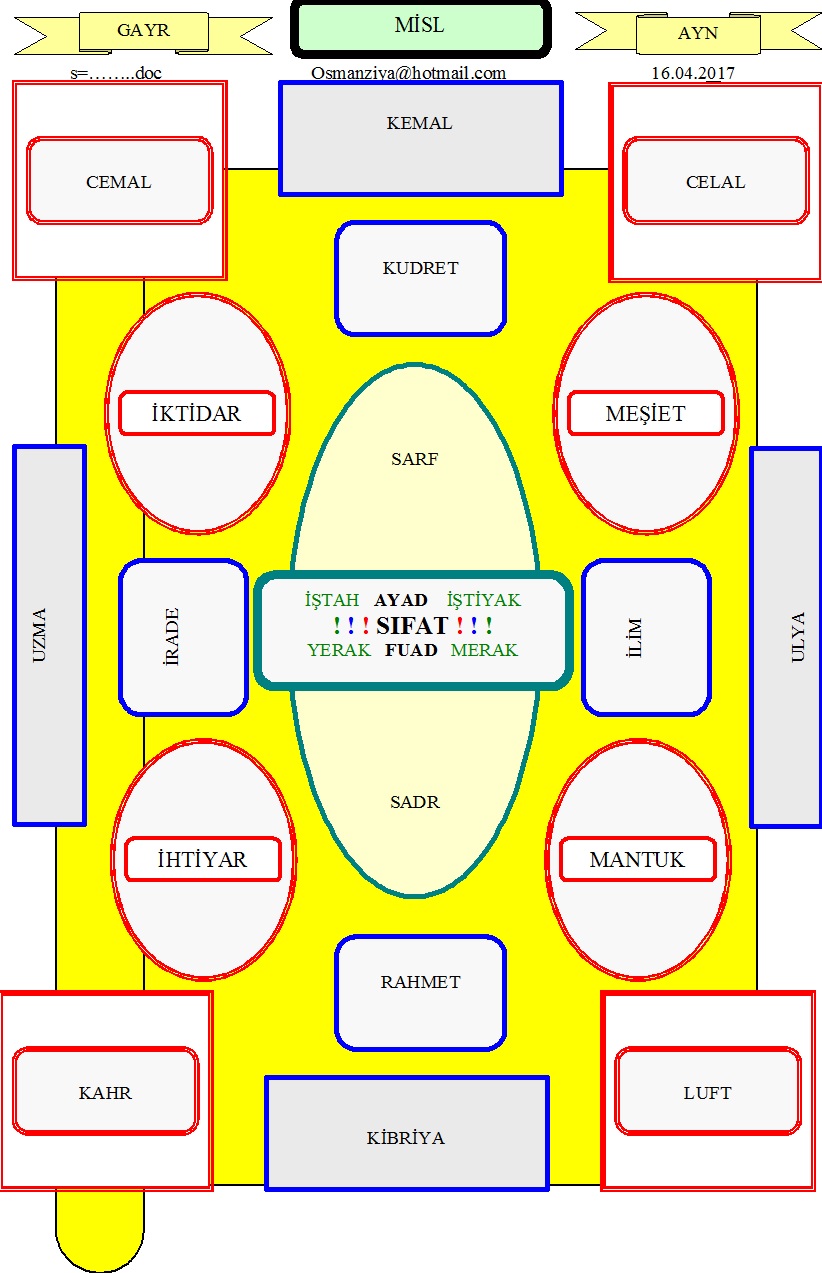 Sanırım tabloları incelemediniz.. kırka yakın bu tablolarda SIFAT kemal ve kibriya olarak ayrıldı.. kemal ve cemal ve celal olarak üç şuunat ile ayrıldı.. uzma ve ulya ve kibriya olarakta zat birleştirildi.. Tabloda yukarıdan aşağıya ya kesretten vahdete bir gidiş yapıldı.. sonuçta ZAT ve SIFAT külliyeti düşünüldü.