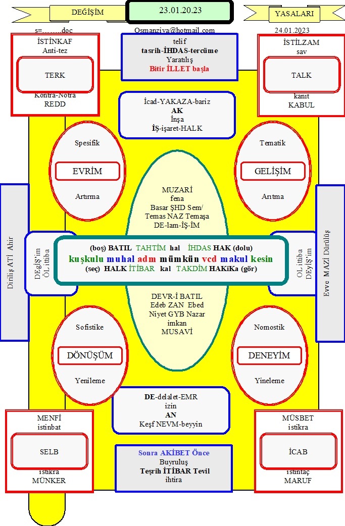 Dindarlar, laikiler, solcular, sağcılar.. her türlü yaşam gidişatında herkes başkaları da kendisi gibi düşünsün ve inansın ve yaşasın istiyor.. bunu nedeni beğendiği bir hakikatın ve değerin başkasının da yararlanması değil.. kendine benzetmeye çalışarak gittiği yolun haklılığını kendine kanıtlama çabası.. fakat asıl neden nedeni de dil ve din ile emek ve özgürlük gibi ortak insani değerleri partilerine paravana ve alet.. ideolojilerini paratoner ve bayrak yapılmasıdır. Peki dil ve din ile emek ve özgürlük ortak insanı diğerlerin böylü kötü ve kötüye kullanılmasının önüne nasıl geçebiliriz ? Ya beynin içindeki sınırları aşarsın, ya da efendinin belirlediği daracık alanda yaşarsın. İkisinin ortası yok bunun... Recep Bayhan DÜZELTİLMİŞ: Sözcuk ve adlar SÖZLUKLERDE bulunur. Sözler ve tümceler BETIKLERDE olur. Sözlüklere LUGAT deniyor. KITAB'a da "Betik" diyorum. Bu tablolarim ne sözcuklerin tarfini yapan sözluklere ve lügatlara benzer ve ne de nazım (şiir) ya da nesir (duz yazı) olan kitablarda tümce ve cümlelere benzer. Bu tablolar sözlük ve betiklerden "ayrı" bir anlam taşır ve anlatim yüklenir. Bu "ayrı"lığı size ne ben ve ne de başkası size anlatabilir. Tabloya bakarak, onu imgeleyer ve irdeleyerek anlatilanları DÜŞÜNEREK siz kendiniz anlamaya çalışacaksiniz.. anladiklarinizi eleştirecek ve anlamadiklarinizi soracaksiniz. Burada kritik bir nokta bulunuyor: Gunluk dilin duz yazisindaki gibi tablonun BUTUNU okumaniz ve TÜMUNU anlamaniz gerekmiyor. Bir sozcugu başka bir sözcukle birleştirmekle ortaya çikan kavrami ve konuyu IMGELEYIP tahayyül ettiginizde.. bir ad"ı başka bir ad'a yaklaştirmakla ortaya çikan anlami ve anlatimi IRDELEYIP tevehhum ettiginizde.. ve manasıni bilmediginiz kelimelerin anlaminı sozluklere bakip.. ya da doğrudan bana sorarak.. öğrendiğinizde.. Öğrenme canli bir gereç.. düşünme diri bir araç.. anlama yaşayan bir sureç haline gelecek.. ve bana soru vs eleştiri yöneltebilirsiniz. Saygilarimla.. sağlicakla kaliniz. Osmanziya 23.01.2023 Üçyol-İzmir Demişim Zeki COŞKUNSU Hocam Demiş: Zaten "İnsanoğlu Referans Sistemi"ne göre "aklın sınırı-tavanı" yoktur; "sınırsız/sonsuz"dur! Dolayısıyla da hiçbir kimse bu referans sistemi içinde bir "mazeret" beyan ederek kendini dondurmamalı-sınırlandırmamalı ve/veya "bahane"lerin arkasına sığınmamalıdır. Ben demişim ki: Değerli Hocam.. once baslat sonra bitir FENA yasasi içinde cereyan eden IMKAN kesin olmadigi gibi kuşkulu da degildir.. bu da MAKULU sınirsiz gösteriyor olabilir mi ? Ve bu konuşuma böyle sürmüş gitmiş.. ve burada söz konusu tabloyu yapıştırmamış ve kimsede sormamış.. nedir bu tablo diye.. O tabloyu buraya yüklüyorum: