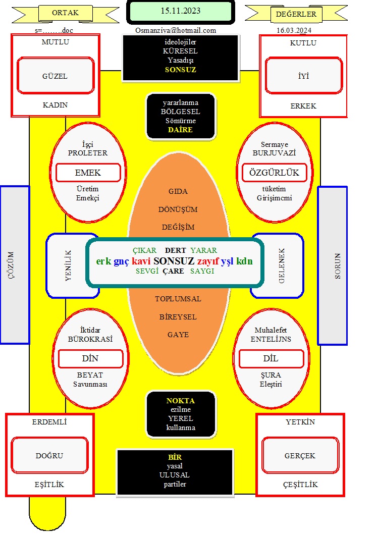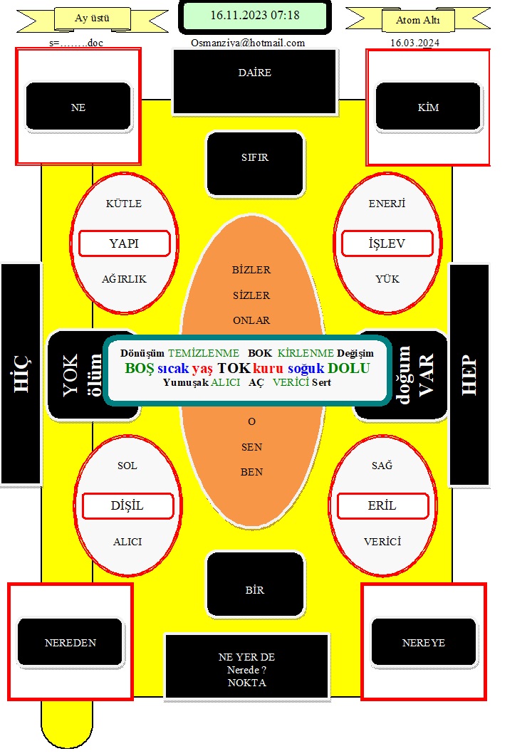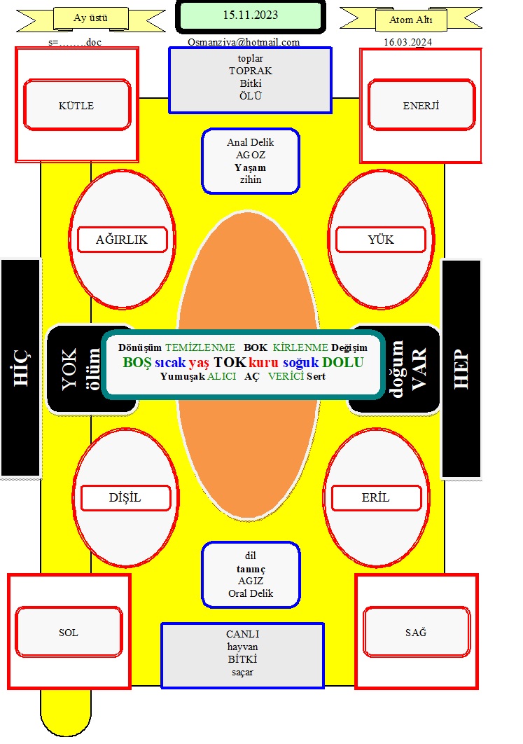 HİÇLİK hakkında hiç bir şey bilmiyorsanız bu yazıyı OKUYUNUZ.. fakat hiçlik hakkında o kadar çok şey bilinler var ki.. DAHA çok onlar okuyacaktır. Fakat siz BİLMİYORSANIZ onlardan daha şanlısınız.. en azından öz.. hiç.. Tanrı.. ben.. gibi var sayılan ya da yok sanılan TERİMLERİN kavramları hakkında bazı düşünceler öğrenmek ve tartışmak ve eleştirmek imkanı doğacaktır. ![]() "Bilgi" "Belge" "Bulgu" "Buluş" "Belagat" "Bulgur" "Bulgaristan" "Teblig" "ibtila" "ibtiga" tüm bu sözcüklerde İLM-İ BELAGAT gizli.. BAGY ve BELİG yan yana durmuş.. Türkçe ve Arapça görünen bu seslerin kökenine giderek ve ETİMOLOJİ ile yani din noktasında kökenbilim yaparak ne elde edebilirsiniz? BELAGAT: Sözünde bile LUGAT (sözlük) görebilmek için sözcüklerin asıl yapısı olan KÖKÜNÜ görme yeteneğini kazanmalısınız.. öncelikle ARAPÇA öğrenmelisiniz.. ya da Üniversite'ye giderken DİLBİLİM alanını seçmelisiniz.. İLİM ve BİLMEK LİSAN ve DİL ilm-i lisan.. lisanın ilmi.. ilmin lisanı.. hangisini tercih edersiniz ? YÖNTEMBİLİM.. bilimin yöntemimi.. yöntemin bilimi .. hangisi ? Bu soruya yanıt vermiyorum.. yanıtını bekliyorum. Başkasına ne verebilirsiniz ? Bir konuda uzman iseniz.. o konuda başkasının bir sorusu varsa onu yanıtlayabiliriz.. bir konusu varsa onun hakkında bilgilendirebilirsiniz.. bu 23 harflik bu uzun sözcüğü yanlış olarak bilgilendErebilirsiniz.. yazarsanız makine orada E harfinin yanlış olduğunu algılar ve sözcüğün altını kırmızı çizer.. Sözcüğün uygun yazılmış olup olmadığını makinenin "algı"laması içerikli bir BİLGİ değildir.. biçimsel ve dil algoritmalarını saptanan bir bilgidir. Şimdi "bilgi"yi böyle sözcüklerle vermiyorlar.. resimler ve videolar ile veriyorlar.. öykülen diriyorlar ve renklendirerek veriyorlar. Az önce baktım DUNE filmi hakkında onlarca youtuber çalışması bulunuyor.. Tüm verdikleri ÖYKÜ üzerinden mesaj vermek ve o mesaj ile bir GERÇEĞİ anlatmak.. YAZARLAR kitaplar yazmışlar.. FİLİM SEKTÖRÜNÜN paradöktürleri ve yönetmenleri ve senaryocuları.. oyuncular ile el ele verip.. bizim hem zamanımızı çalmak hem de belki bir yöne döndürmek için algı operasyonunu geçen KÜLTÜRLEME süreçleri ile kendi benimi ÇALMAK için olanca güçlerini sarf edip harcıyorlar. Sarf etme.. SRF.. kullanma.. ters çevir.. FRS fırsatlama.. Harcama.. HRC.. dışarlama.. ters çevir.. CRH cerrahi yaralama DİL, en az DİN'in yarısı kadar AYDINLATICIDIR. DİLİ kötü ve kötüye kullanma gibi bir emeliniz bulunmuyorsa bunu sizde görebilirsiniz. Şimdi böyle anlaşılmaz bir yazı yazdım: "Dunya enerji ve kutle diye ayriliyor.. kutlenin ağirligi ve enerjini yuku olur.. bilim adamlari şimdi enerjinin agirligini da hesaplamaya çalişiyorlar.. boylece VAKUM BOŞLUGUNDA hiçligin kaç gram geldigini ogrenecekler."15.03.2023 Sonra bu TABLOYU yaptım.. Tablodan ne anladınız.. Biz kütleyi biliriz.. enerjiyi biliriz.. hatta tartar ve ölçeriz. Kütlenin ağırlığını biliriz.. enerjinin yükünü biliriz.. hatta saptarız. Bir erili biliriz dişil isek daha iyi biliriz.. keza dişili biliriz.. .eril isek daha iyi biliriz.. ta kız kadın karı ana ve neneyi kadar. Biz sağ biliriz.. solu biliriz.. hatta ortadaki tablo için AÇ VE TOK VE BOK 'u ve etrafındaki kavramları da biliriz.. Tablonun tam ortadaki sutunu TOPRAK'dan ta BİTKİ'ye kadar yazılanları da OKUR ve ANLARIZ.. Boşluk nedir doluluk nedir onu da çok iyi biliriz.. hele bir boşluk varsa onu doldurmayı da.. Ancak "ölüm" ötesi YOK ve HİÇ hakkında ne bilgimiz var ? Ya da "doğum" öncesi VAR ve HEP hakkında ne gibi bir malumata sahibiz. Varlık ve Zaman hakkında BİLGİLENMEK isterseniz Martin Heidegger okuyabilirsiniz.. fakat elinize geçenin SIFIR olduğunu onun gizemli bir BOŞLUK olduğunu öğrenmekten başka bir kazancınız olmayacaktır. Şimdi elimizde dört kelime bulunuyor: Hiç.. yok.. boşluk.. sıfır.. hadi buna bir tane daha ekleyelim: Nokta. Eni, boyu ve yüksekliği olmayan boyut.. "yok" demeye dilimiz varmıyor.. en iyi var sayalım.. NOKTA.. geomertiiyi inşa etmek için SONSUZ yüzlü DAİRE ile birlikte kullandığımız bir başka bilinmez. Şimdi bu kurduğum tümceler gibi MUHTEŞEM ve ÖZGÜN ve HİÇ bir yerde yazılmamış cümleler kurmak istiyorsunuz değil mi ? Kuramazsınız ki.. benin yaşadığım yaşamadınız ki.. peki ben yaşadım ve kurdum.. ELİME ne geçti.. BU GÜNE KADAR "HİÇ" bir kişi ben senin gibi cümleler kurmak istiyorum diye YBA öğrenmeye ve kullanmaya ve yararlanmaya kalktı mı ? HAYIR demeyeceğim HİÇ BİLMİYORUM. Yani kesin kes konuşamam. Doğrusunu Allah bilir. Belki onlarca kişi NİYYET etmeye çalıştı.. şu veya bu nedenle TEŞEBBÜS etmedi.. ya dünyevi meşguliyetleri onu bırakmadı.. ya düşünmeye cür'et edemedi.. ya konuşmaya cesaret edemedi.. Belki de gelecekte YÜZBİNLERECE belki MİLYONLARCA kişi YBA dilini edinecek ve kullanacak ve ondan yararlanacak.. bunu da HİÇ BİLMİYORUM.. belki de geleceğe ulaştırmak üzere siber uzaya emanet ettiğim bilgiler uzayın derininde ve tarihin çöplüğünde kalacak.. hatta DİJİTALİZM her şeyi bilgiden ibaret görüyor teneke kafasında.. HİÇ BİLMİYORUM.. Ancak şu anda bildiğim bu tablo, bize HİÇLİĞİN kütlü ya da enerji olarak ölçülemeyeceğiniz gösteriyor.. boyutları.. alanları.. kuvvetleri.. kütleleri ve yükleri bir şekilde ölçer etkileri ve tepkileri hesaplayabilirsin lakin yokluğu ve hiçliği ölçüp hesabını YAPAMAZSIN dediğimde maddiyat temasınin nar ve zerratı.. ve maneviyat temaşasının hücre ve seyri arasında.. lafz ve mana.. zikir ve fikir arasında.. hayal ve vehim arasında.. NİHAİ kurama varamazsın demek istiyorum. Bu gün popular science derginin 68 nci sayfasında HİÇLİĞİN AĞIRLIĞI başlıklı yazıyı okuduğumda.. VAKUM (boşluk) deneyleriyle Paul Davi