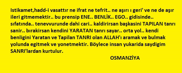 ![]() Istikamet,hadd-i vasattır ne ifrat ne tefrit.. ne aşırı ı geri' ve ne de aşır ileri gitmemektir.. bu prensip EGO.. gidisinde.. BENLİK.. sıfatında.. ENE.. tenevvurunde dahi cari… Ego’yu kaldirirsan başkasini TAPILAN tanrı sanir.. Ene’yi kendi başına bırakirsan kendini YARATAN tanrı sayar.. orta yol.. kendi benligini Yaratan ve Tapilan TANRI olan ALLAH'ı aramak ve bulmak yolunda egitmek ve yonetmektir. Böylece insan yukarida saydigim SANRI'lardan kurtulur. âsar.. efal.. esma.. sıfat.. şuun.. zat'a doğru gittikçe sınava zorlaşır.. yarış güçleşir.. idaresi en zor olan kendi benini eğitmek ve yönetmektir.. bu aşamaya kadar kendini eğitmek başkasını yönetmek.. başkasını yönetmek kendisini eğitmek iken bu kerteden sonra eğitilen ve yönetilen kendi kendisidir. O vakte kadar her şey bir odak idi.. ikili idi.. amma bundan sonra özektir.. merkezdir.. teklidir. KESRET ve VAHDET... Selb ve icab.. ilim ve imana girişte ona bir kolaylık sağlıyordu.. HALK ve HAKK terk ve talk.. emel ve amel yürüyüşünde büyük bir zorlanma çıkarmıyordu.. ancak bunların külliyetinde ve cem'inde oldukça zorlanacak ve iş güçleşecektir. işte bu noktada "ene"nin işi zordur.. tüm bildiklerini unutmak ve yeni bir durumu intibak etmek.. bulunduğu TESLİMİYET yerinin hakkını vermek. Teffenî müslimen velhıknibissalihîn.. (Yusuf 101 ) yükseldiği İSLAMİYET konumun gereğini yerine getirmek.. çok ama çok zordur.. Rabbi heb li hükmen velhıknî bissalihîn.. (şuara 83 ) Nefs’e hakim olmak ve Ene’sine teslim olmamak kolay bir iş değildir. Hasılı ne yapıp ne edin ancak Müslüman olarak ölün (ali imran 102) buyruğuna istenci baş eğdirmek yolunda Allah yar ve yardımcımız olsun. Amin. OSMANZİYA yapan bilir.. bilen konuşur.. der İmamı Nursî.. ancak bazen yapabilen yapmasa da konuşuyor.. bu bizim ortak insani tarafımızdır.. yazarlığı-mız ve okuyuculuğu-muzdur.. burada belirtilen yüksek konumda bulunmasak değil.. basiretimiz ya da nazariyemiz ile onu görüp söyleyebiliriz. Aslında bu çok yönlü ve yanlı alanlara.. örneğin insana ilişkin konularda.. yöntembilimsel analizle oluşacak İNSANBİLİM ile çok geniş bir katılım yapılacağını düşünüyorum. Yapılanlar ve yazılanlar.. edebiyat ve nasihattan.. vaazdan ve tebligattan öteye geçmiyor. Yapmayanın bilmediği konularda konuşmaması gerekirken.. bu lazimeye uymadan düz yazının iliyle konuşuyoruz.. yapabilenlerden.. yapanlardan.. özür dilerim.. Yaratan'dan bağışlanma dilerim. Benim meramım sadece yöntembilimsel analizin reklamını yapmaktır. ![]() |
