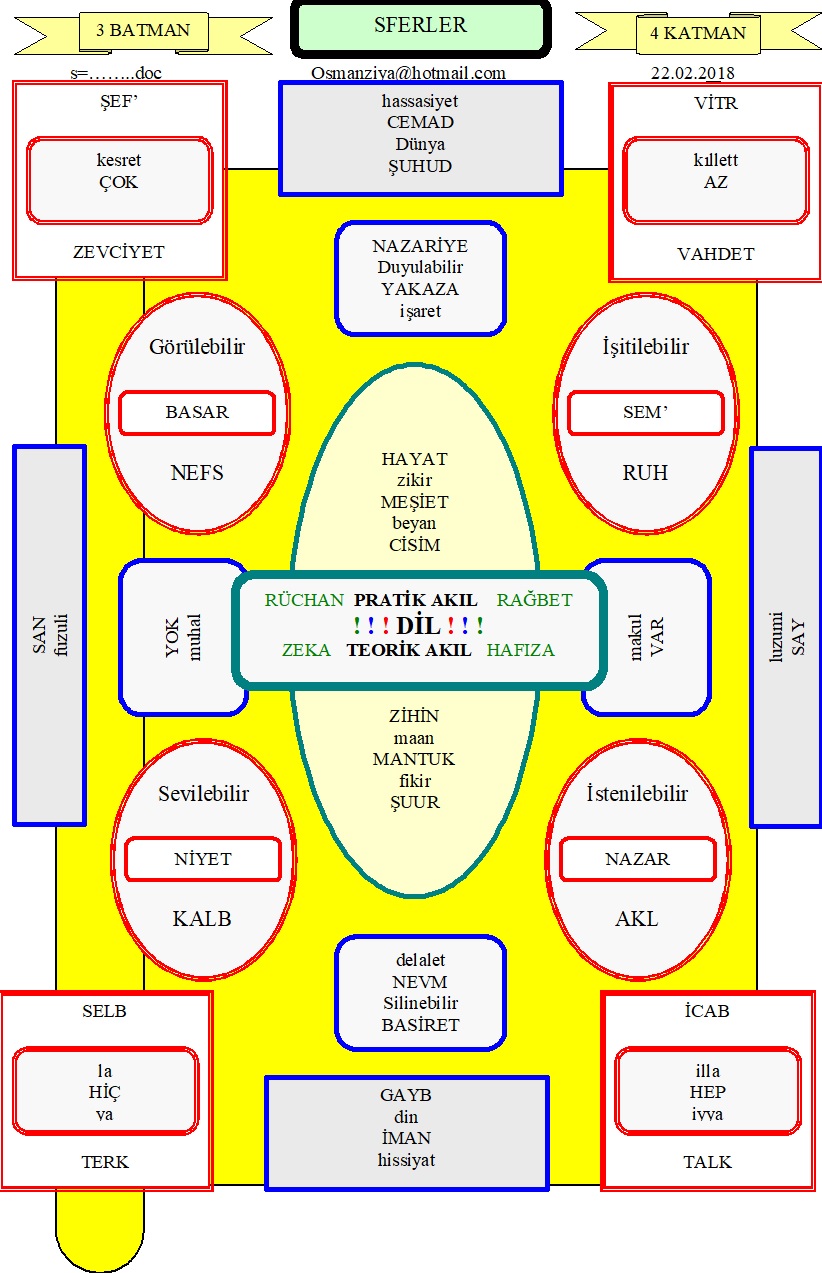 | KATMANLAR KATMANLAR dizini içindeki dosyalar 20180222_090127_KATMANLAR.rar KATMANLAR ve aralarındaki BATMANLAR.. Bu dizin için 20 tane tablo bulunan bir HABLO var. Sekiz tane de düz yazı bulunuyor. S= olarak ad almış dosyalar tabloları taşıyor. M= olarak ad almış dosyalar düz yazı taşıyor. Burada m=katmanlar düz yazısı s=katmanlar başlıklı tabloları tanıtmak için yazılmış bir reklam yazısı oluyor, yani işbu.. işte bu yazı… Malum tabloları düz yazıya çevirmiyorum.. çünkü onu yöntembilimsel analiz dilini.. anlam sürücü ve anlatım aygıtı içeren yapı ve işlevini öğrenen ve kullanan arkadaşların yararlanması için geleceğe bırakıyorum. E peki siz buraya kadar gelip bu yazıyı niye Okudunuz.. Okuyorsunuz.. Okuyacaksınız.. Arıyorsunuz.. bilgiyi arıyorsunuz.. bilgi konusunda bulunan düşünceyi arıyorsunuz.. bilgi konusunda bulunan görüşü arıyorsunuz.. eğer beni okuyorsanız büyük bir olasılıkla bu bilgi, görüş ve düşünce gündelik dil ve bilimsel bilgi düzeyinde olan çoğunluğun aradığı olağan ve normal bir bilgi değildir.. daha derinde ya da daha yüksekte olan.. felsefi ya da dini bilgidir. Eğer böyle ise varlıklar hakkında dört katman olduğunu söylemeliyim size.. zaten yukarıda bir dört katman saydım; günlük bilgi, bilimsel dil.. felsefi bilgi ve dini dil.. bunlar bilgi ve dil tabakaları.. birde varlık sferleri var; Cemad Hayat Şuur İman İşte bu yazıda bu katmanlar arasında bulunan “batman”ları öğreneceksiniz. Sağlıcakla kalın. OSMANZİYA Sentaks / sözdizimsel / BEYANÎ eksikliklerim VE semantik / anlambilimsel / MAANÎ yetersizliklerim için düz yazıdan özür dilerim   http://sites.google.com/site/yontembilim/ http://sites.google.com/site/insanilim http://groups.yahoo.com/group/BAKARA/ http://groups.yahoo.com/group/oku-ikra/ http://groups.yahoo.com/group/yontem-bilim/ http://groups.yahoo.com/group/insanbilim/ www.yontembilim.com www.insan-bilim.com | |