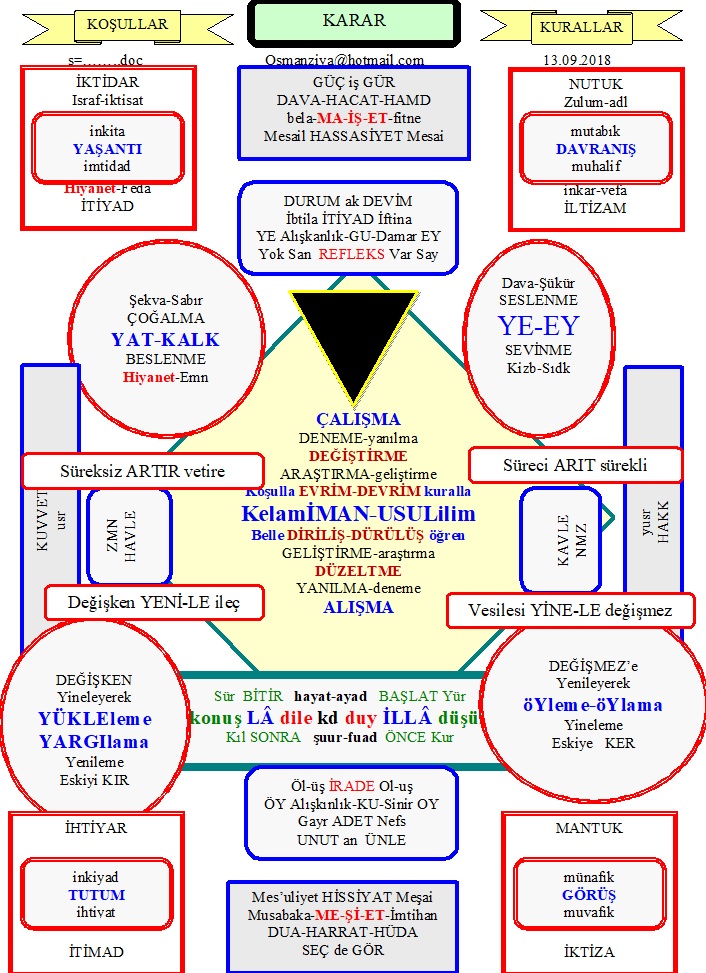 "Alışkanlıklar" her bir insana "hastalıklar" gibi verilen ikramlardır.. her ikisi de kurtulunması gereken durumlardır.. bazı durumlardan kaçarken ve bazı durumlara koşarken.. ortaya bir "irade" koyarız.. işte bu bizim var oluşumuzu oluşturur ve bunun akılla, mantıkla hatta fayda ve zarar ile de alakası yoktur.. önemli olan o işi yapabildiğin ya da yapamadığındır… Alışkanlıklar ya da alışkınlıklar.. ben damardan gelene alışkanlık, sinirden gelene alışkınlık derim.. damar ya da sinir.. buna şöyle de diyebiliriz, yaşantımızı ilgilendirenlere ALIŞ-KAN-LIKLAR.. davranışımız ilgilendirenlere ALIŞ-KIN-LIKLAR.. diyebiliriz. Kan sözcüğü damarı, kın sözcüğü ise siniri gösteriyor. Osmanziya der ki “İktidarımız kadar değil itiyadımız kadar yapar, ihtiyarımız kadar değil itimadımız kadar ederiz” oysa biz hep iktidarımızı ve ihtiyarımızı suçlarız.. itimadımız İHTİYAT.. itiyadımız da İMTİDAD denilen özel ve sihirli bir formülle düzeltilebilir.. eğer bu formülün denklemini bulursam.. sizlerle böyle goley goley paylaşmayacağım.. parayla satıp köşeyi döneceğim ;) Kelin merhemi olsa başına sürer  Bence alışkanlıklar ve alışkınlıklar kurtulma gibi zor bir işe girişeceğinize onlarla uyumlu yaşamayı sürdürün daha goley… Benim hastalığım ve alışkanlığım ve de alışkınlığım da YBA.. bir türlü kurtulmak istemiyorum bundan.. bir de üstelik başkasına bulaştırmak istiyorum bu mikrobu.. artık ajanı virüsmüdür.. bakterimidir.. bilmiyorum bir türlü de bu MİKROB'un anti-biyotiğine başvurmuyorum. Her ne ise.. bu alışkanlıklar ve alışkinliklardan başka bir de EMELLERİM vardır.. dört tane; hizb-i mahsus, hülasatülhasıla, insanbilim ve yöntembilim.. bunlardan HÜLASATÜLHASILA.. yani hasıl ettiklerimiz hülasası.. ürettiklerimin özeti.. yani bin tane tablo yapmışsam bunların cami ve külli olanların yüz tanesini derlemek ve toplamak.. yöntembilim emeliyle uğraşırken ve bu amaçla face itiyadıyla bir türlü buna fırsat bulamıyordum.. sonra gördüm ki son tabloların bir tür ÖZETLER haline geliyor... işte burada sakladığım tablolarda bu tür tablolar.. yöntembilimsel analizi TALİB arkadaşlarımın dikkatini çekerim.. bunlara sahip çıksınlar.. Hayatta sizlerinde böyle alışkanlıkları ve alışkınlıkları olsun.. hem de benimden daha iyisi ve daha güzeli ve bir de böyle emelleriniz ve gayeleriniz bulunsun.. hem de bundan daha doğrusu ve daha gerçekçisi.. Allah bizim ve sizin akibetimizi ve ahiretinizi iyi ve güzel etsin. Amin. Bilgi, sevgi, saygı ve sağlıcakla kalınız. Osmanziya Üçyol, İzmir.. 11.45 12.09.2018 20180912_114757_3_PAKET.rar | |