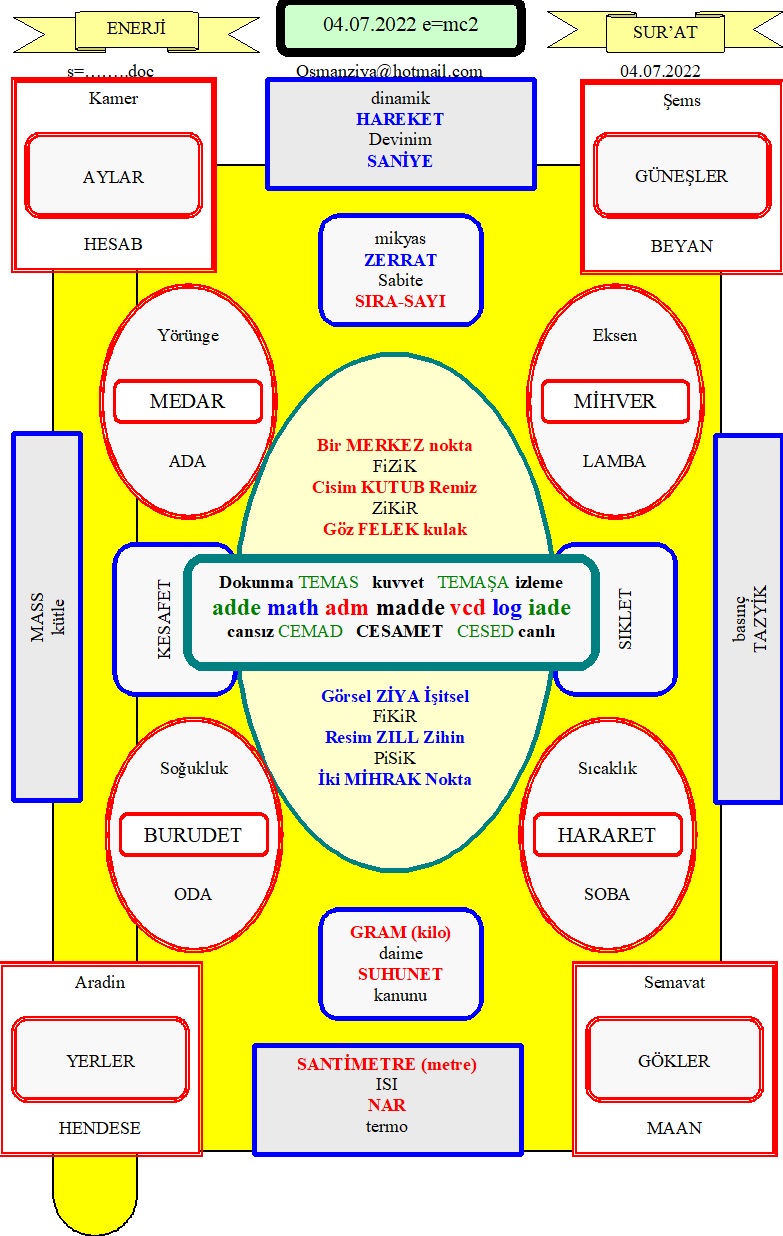 FİZİK YASALARI ÜZERİNE FIZIK YASALARI UZERINE dizini içindeki dosyalar 20220704_190152_FIZIK_YASALARI_.rar Dilimizde dört kelime var.. yerleşmiş 4 sözcük bulunuyor: FiZiK ve PiSiK ile ZiKiR ve FiKiR Ayrıca dört bağlantılı sözcük bulunuyor: Cisim ve Zihin ile Remiz ve Resim YBA ile günlük dilin düz yazısı ile bağlantısının kurulması uzun açıklamalar isteyen bu sözcükler dikkatli ve entelektüel bir şuura hemen kendilerinin dokusunu hissettirirler. Ancak ne olduklarını anlamaları için bu yazı ile paylaşılan tabloları ince ince elemeleri gerekir. İlgilerini çekerse, emek ve zaman harcarlarsa. Fizik cisimle Pisik zihinle Zikir remizle Fikir resimle İlgili değil mi ? YBA resimli ve geometrik bir fikir ve mana çalışması değil mi ? Biraz düşünürseniz.. hadi olmadı biraz daha fazla düşünürseniz anlarsınız. Bu dizin içindeki dosyalarda Dick olarakta anılan Ünlü Fizikçi Richard P. Feynman’ın FİZİK YASALARI ÜZERİNE kitabından alıntılanmış dört sayfası da bulunuyor. Feynman’ın kitabını, daha önce iki kalın cildini okuduğum SİCİM KURAMCISI ve dünya bilim festivali başkanı Brian GREENE’in Evrenin Zerafeti ve Evrenin dokusu kitabını okuduğum için anlamakta zorlanmadım, bu DİDAKTİK kitabı didik didik ettim. Çokta yararlandım. Bu yazı ve tablolardan sıkılırsanız alıntıladığım dört sayfalık yazıyı okursanız oldukça yararlanırsınız.. belki asıl kitabını da alırsanız yararı daha yükseltirsiniz. Genelde maddeyi okuyan mana ilimlerini okuyanları aptal görürler.. nitekim Feynman da açıkça filozoflara aptal diyor. Mana ilimlerini okuyanlarda fizikçileri gereksiz bulurlar. Fakat biz her ikisini de okuyarak ne mana ilimlerini aptalca bulduk ne de fizik ilimlerini gereksiz gördük.. sanırım yeni bir anlayış.. yeni bir kavrayış.. yeni bir nesil geliyor ve biz onların öncüsüyüz. Beyin her iki lobuyla çalışır.. ilim her iki yönüyle elde edilir.. aklını ve kalbini çeliştiren.. dini ve bilimi çarpıştıran.. zamanın paradigma ve dogmalarının etkisinde kalmışlardır.. o kadar.. zaten bu dogma ve paradigmaları kişiler duyumsayamaz.. ancak çağlar onların farkına varır.. çünkü onların dertlerini çeke çeke zamanda yürürler.. ta ki devası bulunsun. Dizinlerindeki tablolarla; FİZİK’i anlattım. Nar’ı anlattım. Suhunet’i anlattım Suhunet nedir, dizini boş.. onu siz dolduracaksınız.. biraz bilgi verecem. TDY yani Termo-Dinamik Yasaları anlattım. Bu dört beş dizin içindeki dosyaları sakin bir zamanında incelerseniz.. fizik hakkında bir kanaata ulaşırsanız.. Büyük bir olasılıkla ulaşamayacaksınız.. o zaman Greene’nin Evrenin Zarafeti ve Evrenin Dokusunu okursunuz. Halk için matematiksel olmayan terimlerle fiziği ve evrenin anlatılmasına çalışan bu kitaplara, Popülize edilmiş kitaplar adı verilir. Anlamak isteyen için oldukça büyük bir emek verilmiş bu kitablara.. Burada sunduğum tablo NAR denilen nesneyi anlatıyor.. bizim atomlarımız ve hücrelerimiz enerji paketçiklerinden ibaret. Aslında bu sözcük e-nar-ji demek ve kimse enerjinin ne olduğunu bilmiyor.. ama yararlanıyoruz.. zaman ve mekanın ne olduğunu bilmeden içinde bulunduğumuz gibi.. Ancak hiçbir şey bilmiyoruz da değil.. çok şeyler biliyoruz ki bildiğimiz enerjiyi enerjiye dönüştürerek enerjilerden yararlanıyoruz. Bu işin bilimine de ENTROPİ diyoruz. Başka bir anlatımla TERMO-DİNAMİK (hararet ve hareket yasaları). Lisede öğrendiğim matematikten fazla matematik bilmem.. ancak bu popülize edilmiş fizik kitapları fiziği öylesine güzel anlatıyorlar ki, elbette anlamak isteyenler için.. fiziği anlamak için matematik şart değil.. ve hatta fizik yapmak içinde şart değil.. çünkü matematik öyle ayrıntılı.. fizik öyle ayrıntılı hale geldi ki.. dahi olmayanlar için her ikisini de birlikte öğrenmek mümkün olmadığı için bu gün fizikçiler ayrı matematikçiler ayrı çalışıyor.. gerektiğinde bir araya gelerek çözüm oluşturuyorlar. Yukarıda adını verdiğim kitabları okursanız bu işin tarihini okursunuz.. Newton.. Maxvell.. Mach.. Enistein.. Shröndinger.. Heisenberg.. geçen yüzyılın ünlü isimleri.. bu yüzyılın isimlerini kitaplardan öğreneceksiniz. SUHUNET hakkında bilgi verecektim: Sıcaklık, hararet Soğukluk, bürudet Isı ise sühunet. Hararet, bürudet ve sühunet kavramları hiç kullanılmıyor. Isı, hem sıcaklığı hem soğukluğu gösteren bir terim. Ancak halkın kafası karışmasın diye hem sıcaklık hem soğukluk SICAKLIK ile gösterilir fakat soğukluk için EKSİ sözcüğü eklenir.. Soğuk ve sıcak arasındaki ISI durumuna da ILIK adı verilir. Keza mor ötesi ve kızıl ötesi arasındaki IŞI durumuna IŞIK dendiği gibi. Isı ve ışı; hava, toprak, su ve ateşten önce en birinci YAŞAMA koşullarımız. Bu koşulların tümüne birden FİZİK adı veririz. Fizik koşullar ise göz ve kulak tarafından görsel ve işitsel olarak algılanırlar. Bu bu algıları gram, saniye ve santimetre ile sıraya ve sayıya bağlayarak FİZİK yaparız. Fizik kuramlar MANTIK.. fizik deneyler ise MATEMATİK isterler. Peki kuram ile deney arasında ne var.. Mantık ile matematik arasında ne var ? Neden ve sonuç arasında ne var.. Amaç ve araç arasında ne var ? Hadi tüm bunları kağıt ve kalemle TABLO yaparak Suhenet nedir.. dosyasını inşa edin. Sağlıcakla kalın OSMANZİYA Sentaks / sözdizimsel / BEYANÎ eksikliklerim VE semantik / anlambilimsel / MAANÎ yetersizliklerim için düz yazıdan özür dilerim . NOT: Evet, aslında benim kullandığım sistemde cümleye, kelimeye hatta harfe de ihtiyaç yok… www.yontembilim.com www.insan-bilim.com www.islam-bilim.com www.osmanziya.com www.mustafabugucam.com.tr ![]() Düzenleyen osmanziya - 04-Temmuz-2022 Saat 22:54 |