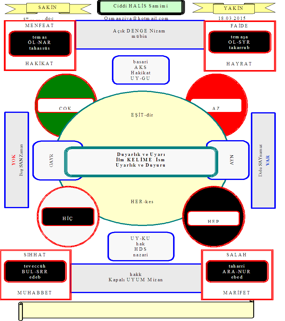YAKIN dizini içindeki dosyalar. 20150318_145949_YAKIN.rar Yakın.. uzaktan bakınca bir mum ışığı ile bir yıldızın ışığı aynıdır. Fakat yakından bakınca ancak birinin mum birinin güneş olduğu açığa çıkar. Görünürde insanın ciğeri ile koyunun ya da maymunun ciğeri benzer. Fakat insanın uygarlığı vardır fakat maymunun uygarlığı yoktur. Ancak insaniyet-i suğra olan beşeriyetinin.. medeniyetinin.. insaniyetinin sorumluluğunu aldığımızda insaniyet-i kübra olan islamiyetin yükümlülüğü altına gireceğimizi ve dilimizin dinimiz olacağı anlaşıldığında bu ağırlığın altına kimse girmek istemez. Ayniyeti ve hürriyeti ile enaniyetini ve ebedtiyetini başka yerlerde arar. Bulduğunu da olur. Sanrısı tanrı.. olur.. tanrısı kendi "gibi"lerinin sayısınca çoğalır. Acaba "ben" de onlardan mıyım ? diye şaşırırsınız ! Evrenin.. insanın.. tanrının.. birbirlerine benzerliği karşısında apışıp kalırsınız.. işte ilgi.. bilgi.. sevgi.. den sonra şaşırma durağına gelmişsiniz demektir.. işte bu yüklenen dosyalar bu konuda size yardımcı olacaktır... Herkes eşittir.. YATAY konumda ve Yaratan karşısında; menfeat ve hakikat, faide ve hayrat, marifet ve salah, muhabbet ve sıhhat.. ya açık ve seçik TÜRKÇE'den sonra tamamen ARAPÇA sekiz sözcükte ne oluyor ? Bu tablonun çıkartıldığı YAKIN.rar dosyasında tabloları versiyon sırasıyla incelediğinizde az-çok anlayacaksınız.. herkes hiç anlamamazlık yapamayacağı gibi hepsini birden de anlayamaz.. ancak hiç kimse bir kapıyı açmadan.. açmaya girişmeden.. açmaya çalışmadan odaya girmez.. elbette hırsızlar için kapılar kilitlenir ancak aşıklar için kapalı kapalar yoktur.. çünkü DİKEY konumda ve yaratılanlar yanında insanlar, aramayanlar, arayanlar, aradığını ASLA bulamayacaklar, aradığını bulanlar, bulduğunu olanlar olmak üzere beşe ayrılırlar. bulamayanlar ve bulmayanlar da SILA yapmadıklarından.. yapsalar belki.. kapı açılır. İlmel yakin.. aynel yakin.. hakkal yakin.. kuşkudan kesinliğe doğru bilginin sağlamlığının derecesi giderek değişir ve artar.. belge için de bu böyle.. kendi aramızda yaptığımız sözleşme ile noterden yaptığımız sözleşme de elbette birbirinden sıhhat derecesi birbirinden farklıdır.. tapu senedi şeklinde yapılan alım satım ise en sağlamıdır. Bilgi ve belge paylaşımının kolaylaştığı ve yaygınlaştığı çağımızda tam tersine bilgin ve kaynağının sağlamlığı ve sağlığı konusunda gerekli hassasiyet ve yeterli bir ciddiyet bulunmuyor. Bilgilenme elbette güzel ve çıkarlı.. düşünme kuşkusuz iyi ve yararlı.. ancak bilginin yoluna ve yöntemini ve aynı zamanda kaynağını gözden kaçırdığımızda acımız büyük ve kaybımız çok olabilir. gelecek ZAMAN.. boş var sanı.. geçmiş NAMAZ.. dolu var sayı.. görünen NİZAM açık denge.. gizlenen MİZAN kapalı uyum.. denilmiş ve ve böyle uyarlık ve duyarlık ile uyarı ve duyarı dünyası ALEM halene getirilmiş.. sunulan tabloda.. el kullanımı bir tür uy_gu'lama.. gönül çıkarımı ise bir tür uy-ku'lama.. dikey eksende ise tam YEDİ katmanlı dil var ve tam ortada ise dörtüncü düzey olan KELİME var.. kelimenin bir yanı zaman yönündeki ilim bir yanı da namaz yönündeki isim.. ancak bu tablonun en zevkli yani köşe başlarında yer alan.. öl-nar, ol-seyr, ara-nur ve bul-sır.. sırrı arayanlara...