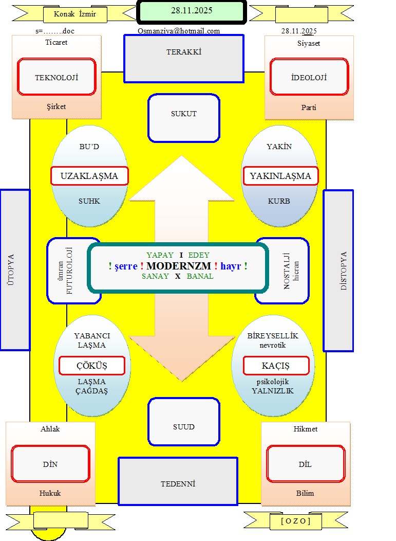[21:47, 28.11.2025] Mustafa Buğucam: sonra modernizme ilişkin her birimiz bazı kelimeler söyledik çağrışımla. [21:48, 28.11.2025] Mustafa Buğucam: 20 tane kavram/kelime tespit ettik ve bunu gördüğünüz gibi ANALİTİK DÜZLEME yerleştirerek [21:48, 28.11.2025] Mustafa Buğucam: Çağdaşlık.. yani modernite.. yani asrîlik.. konusunda ortak zihin haritası yaptık [21:50, 28.11.2025] Mustafa Buğucam: Sonuçta moderninin lehinde ve aleyhinde.. kendimi bilgimiz.. toplantıya katılanların bilgisi.. çerçevesinde söylenecek düşünceleri TOPLU halde bir gösterge yaptık [21:51, 28.11.2025] Mustafa Buğucam: Bunlar bir deneme ve yanılma girişimleri.. [21:55, 28.11.2025] Mustafa Buğucam: İnşaallah ileri de her çarşamba saat 09:00 dan sonra yapacağımız çalışmaları sizi de çağırırım.. [22:01, 28.11.2025] Mustafa Buğucam: Değerli Hocam Vahyin Akedemisi gurubunda yazıma BEĞEN işareti koymuşsunuz.. beğen işaretini onu okuduğunuz anlamında anlıyor. Ancak anladıklarınızdan eleştiri ve değerlendirme görüşlerinizi beklerim.
