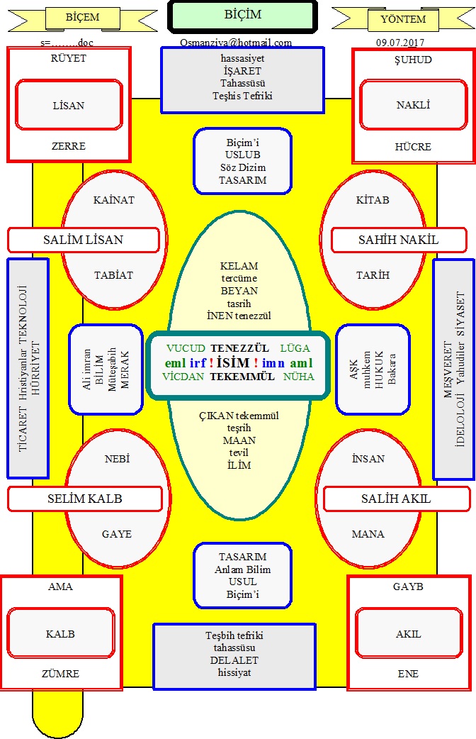 20170709_012735_BICIM.rar Esselamü Aleykum; usul'ün biçimi ile uslüb'ün biçimin merak ettim.. bir sürü gereksiz tümce kuracağımı BICIM dizini içindeki tabloları yaptım.. tam 23+2=25 tablonun ortasındaki 14.ncü tabloyu da kopyalayıp aşağıda yapıştırdım.. sanırım ilim ile kelam arasında duran isim noktasında bir karara varırsınız. Hem de günlük dilin düz yazısından daha kolay bir biçimde.. biçim içinde göreceğinim biçem (uslüb) ve yöntem (usul) kelamın söz dizimi ve ilimin anlam bilimi arasında bir yerde karşılıklı duruyorlar.. uslüb beyanı zikrederken.. usul maanı fikrederken işe yarıyor ve sizde kolayca meramı anlayorsunuz Uzun sözün kısası.. tabloları inceleyin ve görün nasıl örülmüş.. Bilgi ve sevgi ile sağlıcakla kalın. Osmanziya