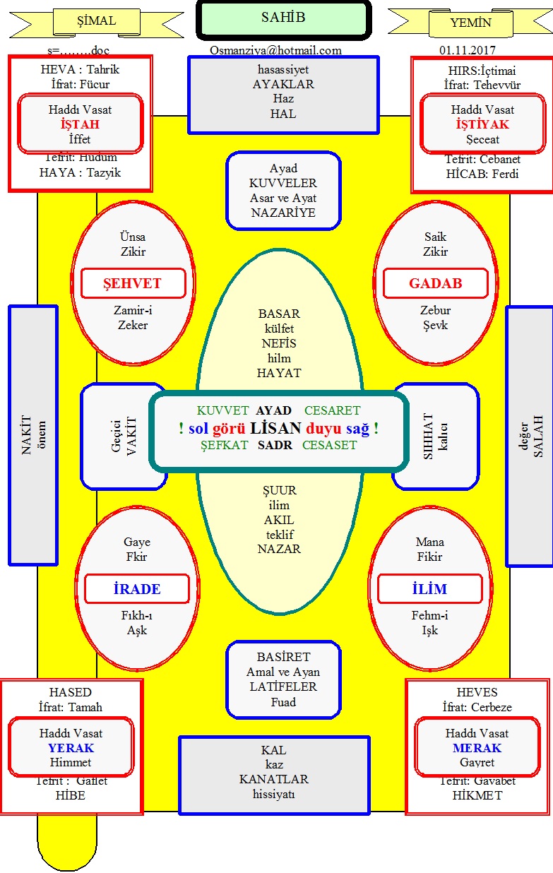 VERICILER dizini içindeki dosyalar RAR dizini içinde 23 dosya (tablo) var 20171101_232321_VERICILER.rar Vericilerimiz varsa alıcılarımızda vardır. Alıcılarımız dış beş duyumuzdur. Göz, kulak, ağız (dil), burun ve deri. Bunlar başımızda bulunan kızlarımızdır. Vericilerimiz gövdemizde bulunan oğlanlarımızdır. İki elimiz.. iki ayağımız bir de pipimiz olan ipimiz. Bu yazının tablolarından vericilerimiz söz konusu edilmiştir. Ayad (el) olan ayaklarımız. Kuvve-i şeheviye ve Gadabiye Ki bunlar tasarruf-u ayaddır. Fuad (gönül) olan kanatlarımız. Kuvve-i Akliyenin ilim ve irade latifeleri Ki bunlarda tasaddur-u fuaddr. Tasarruf nefis ve ruhun hayati işletimleri. Tasaddur akıl ve kalbin şuuri işlemlerdir. Sağlıcakla kalın. OSMANZİYA Sentaks / sözdizimsel / BEYANÎ eksikliklerim VE semantik / anlambilimsel / MAANÎ yetersizliklerim için düz yazıdan özür dilerim