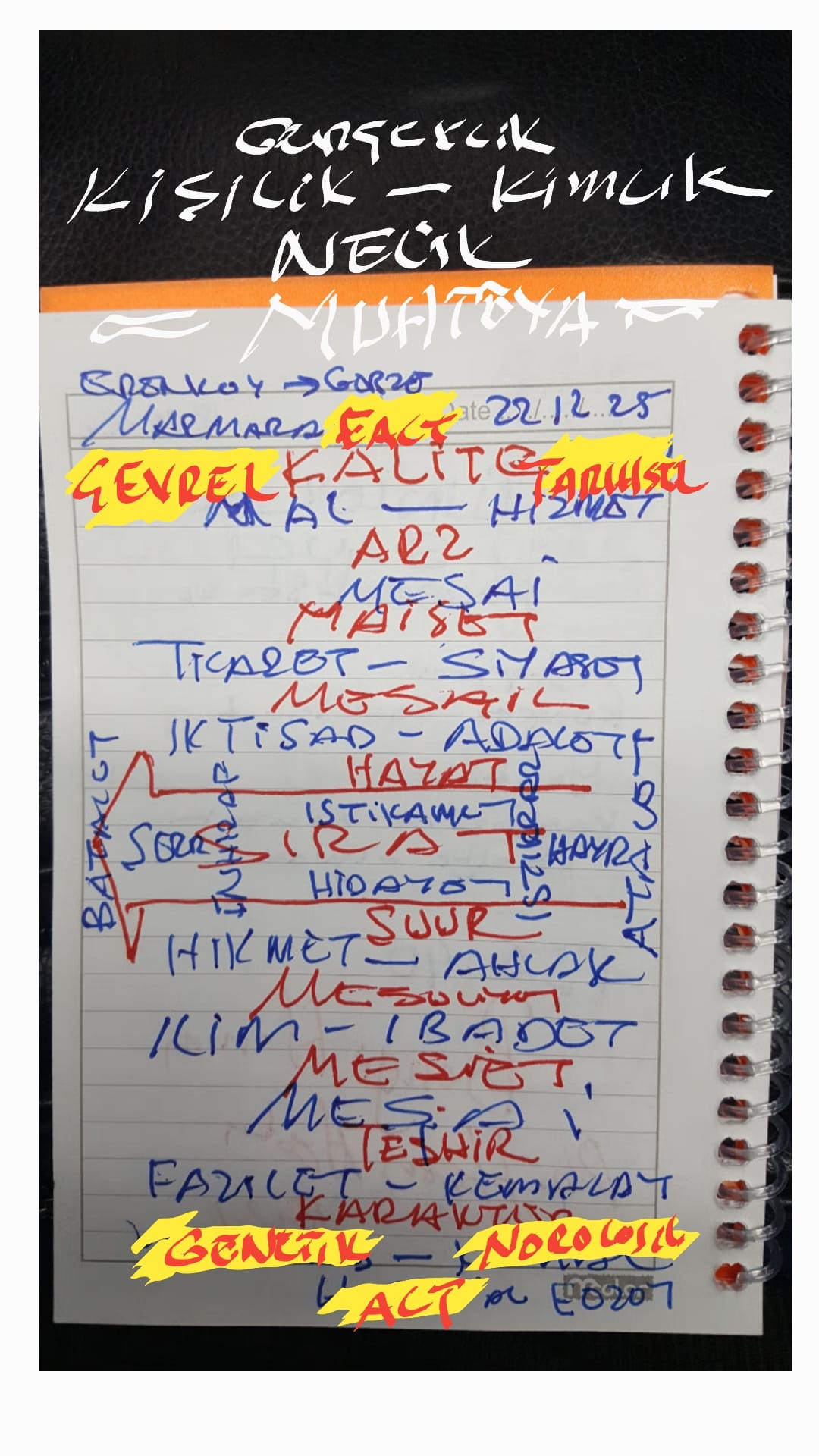 1990'larda idi Ankara Hacıbayram Camii ve çevresinin onarımı yapılıyordu.. oradaki dini kitap satan dükkanların birinde Analitik düzlem üzerine yerleştirilmiş din resmi görmüştüm.. bu tablo dinin çeşitli alanlarını ya da yönlerini gösteriyordu.. nasıl olduğunu şimdi hatırlamıyorum.. ancak dini bu şekilde gösteriyorum bu gün analitik düzlemde.. Üst taraftaki HASSASİYETİN sağı ve solu bulunur.. Alta taraftaki HİSSİYATIN da sağı ve solu olur.. SAĞ ALTTA Akil tarafında İTİKAD SOL ALTTA Kalb tarafında AHLAK SAG ÜSTTE Ruh tarafında İBADET SOL ÜSTTE Nefis tarafında AHKAM Din bunların bütündür. Şimdi soruyorum.. sadece islamiyetin mi itikadı ve ahlakı ile ibadeti ve ahkamı bulunur.. yoksa diğer dinlerde olur mu ? Hatta sadece islamlarda mı bulunur.. insanların olmaz mı ? Hatta dinsiz dediğimiz insanlarda da bulunmaz mı ? İtikad görüş TARZI ahlak davranış ŞEKLİ ibadet tutum TAVRI ahkam yaşantı SURETİ değil mi ? Peki sen kendininkini HAKK diyorsun.. dolu diyorsun.. karşındakine de BATIL diyorsun... boşu diyorsun.. Peki bana boşun ve dolunun ne olduğunu söyleyebilir misin ? Dünyada yaptığımızın karşılığını çoğu zaman alırız.. fakat ahiret için yapılanlardan karşılık beklenirse halis olmaz.. ehli dünya dünyaya bakarak ahiretçilerin işinin BOŞ olduğunu düşünüyor.. ahiretçiler de dünyacılara bakarak işinin BOŞ olduğunu düşünüyor.. Oysa dinimizde hiç ölmeyecekmiş gibi dünyaya yarın ölecekmiş gibi ahirete çalışma dengesi BULUNUYORSA.. ki ben öyle düşünüyorum.. iki tarafta BOŞA çalışıyor mu diyeceğim.. Hayır hepimiz korku ve umud ortaya bir yerde hem dünyaya hem ahirete çalışalım.. ta ki birileri DÜNYAYI kazandığını sanıp bize dünyayı ve ahireti zehir etmesin.. birileri de sadece ahireti kazandığını sanıp dünyamızda bedavadan yeyip içmesin.. bizi ahiret ile kandırıp yukarıyı çıkıp malı götürmesin. osmanziya Düzenleyen osmanziya - 19-Aralık-2025 Saat 22:00 |