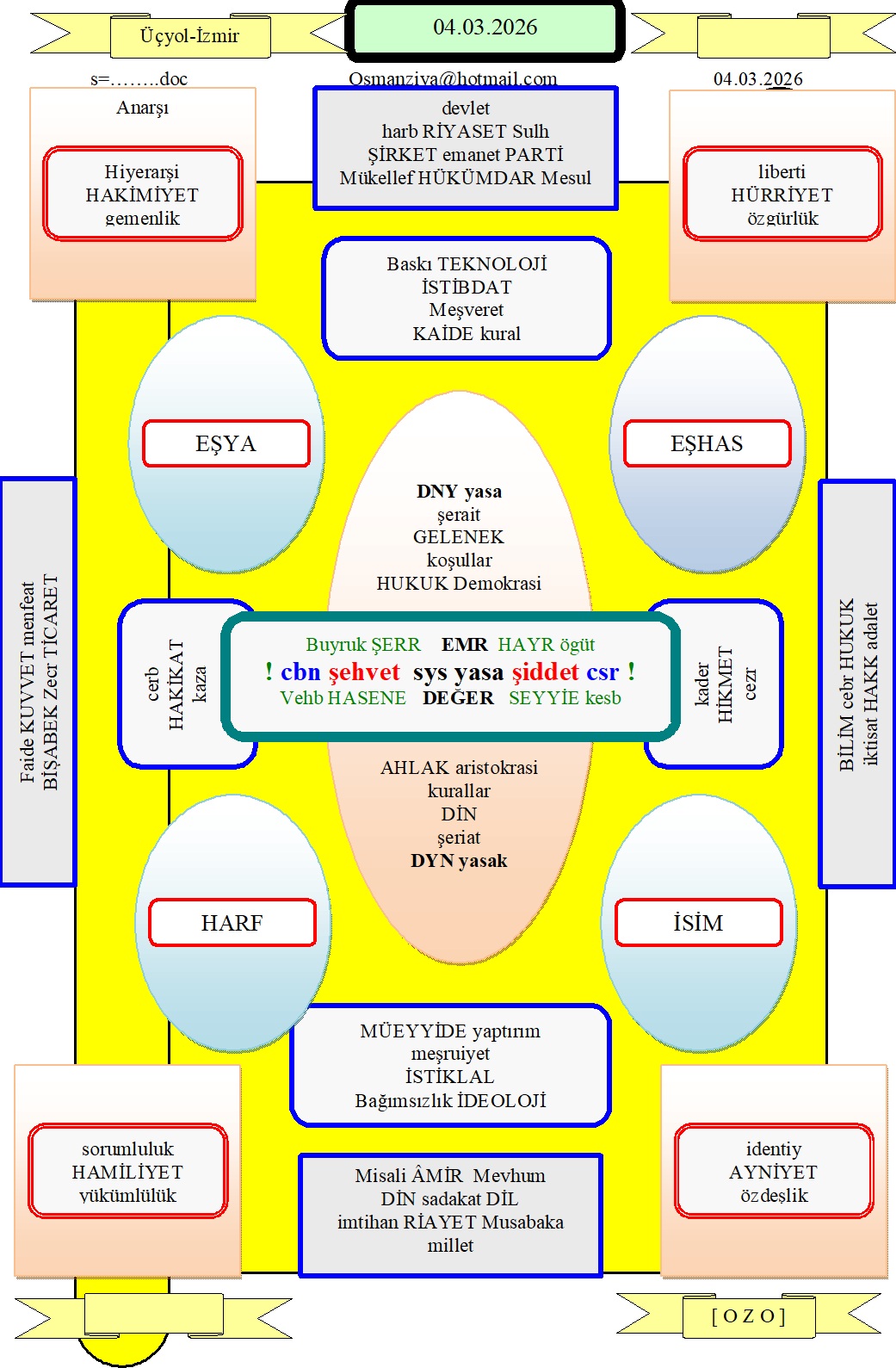 Burada DIKEY beş SOYUT kelimeden ibaret bir anlatım yapılmıştır ki böyle soyut ve yuvarlak kelimeler bir şey anlatır görünür ve fakat hiç bir şey anlatmaz. Kelimeler içinde bulunduğu dili bilinmiyorsa ses ise gürültü ve yazı ise görüntüden ibaret değil mi ? Soyut kelimeler ise sesli ve yazılı GÖSTERGE olmasından öte ANLAMI bilenen ve fakat ANLATIMI yapılmayınca.. örnek gösterilmeyince ve uygulaması olmayan ma'nası bir işe yaramayan lafızlara.. fikri aydınlatmayan zikirlere.. dönüşürler. Fakat bu bir işe yaramaz demek değildir. Önce bir kelimesin sesini duyarsınız sonra onUn anlamını öğrenirsiniz. Bir kaç kez sesi ve anlamı ya da anlatımı ile işitince ya da görünce sözcüğün değişkeni ve değerini birbirine yapıştırarak anlamaya ve kullanmaya ve yararlanmaya başladığınızda artık o kelime sizin bir ışığınız ve aracının ve feneriniz haline gelir.